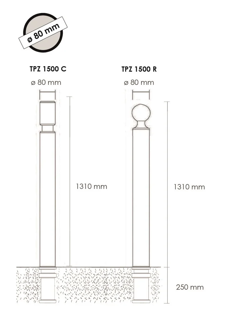 VI-TPZ1500CNB | Flexibler Pfosten zum Einbetonieren, H.1560 (1310) mm, D.80 mm – schwarz |