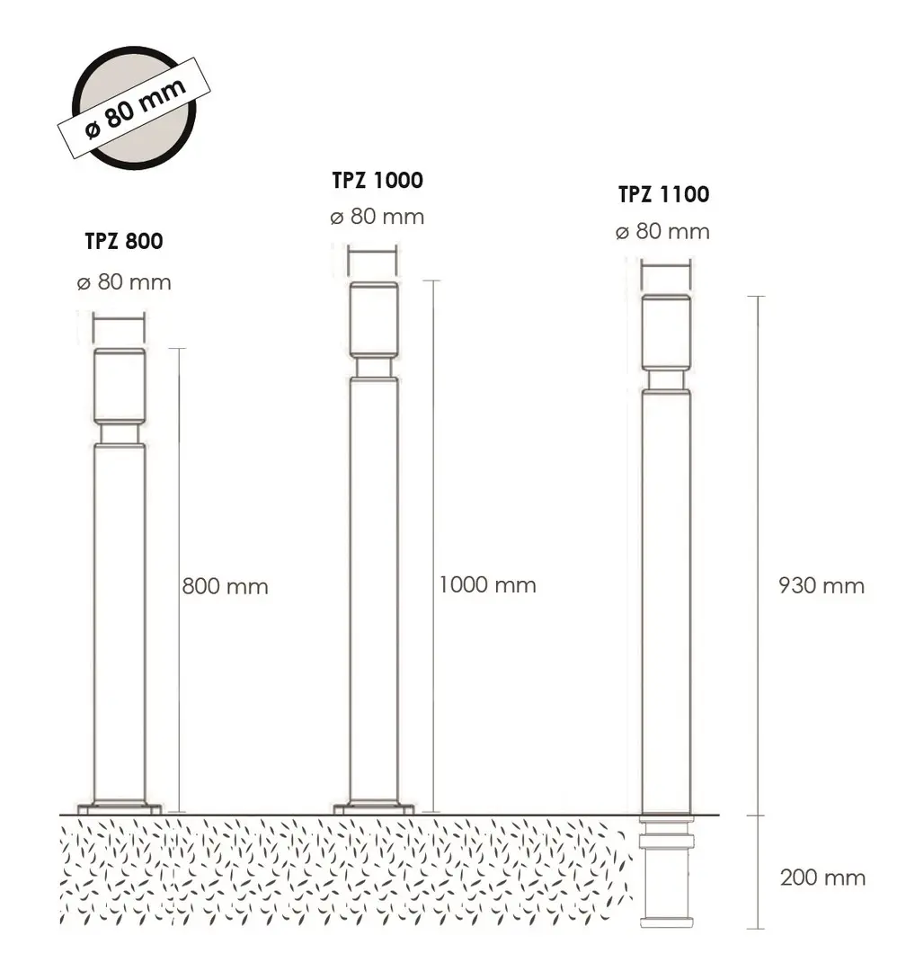 VI-TPZ800RN | Flexibler Pfosten, H.800 mm, D.80 mm, runder Pfosten-Kopf – schwarz |