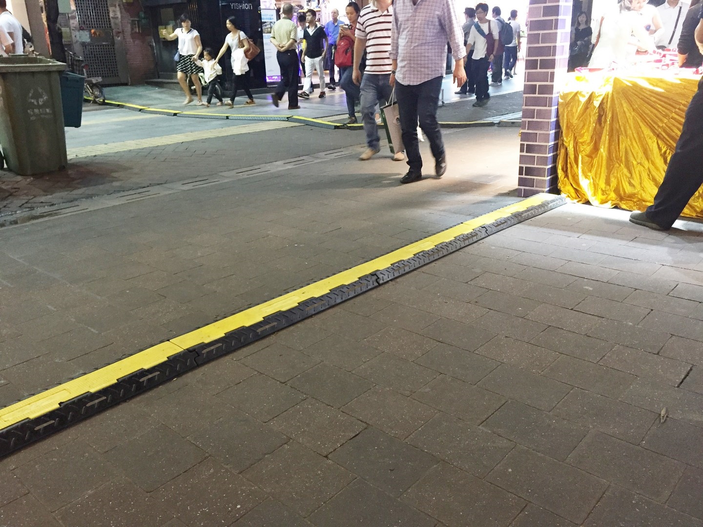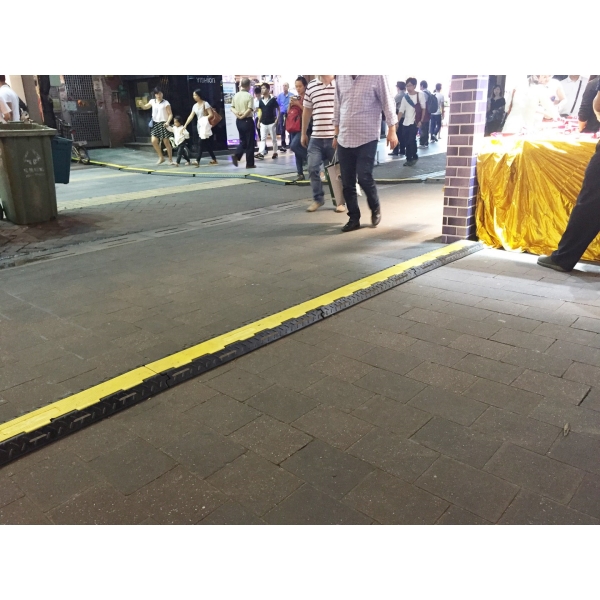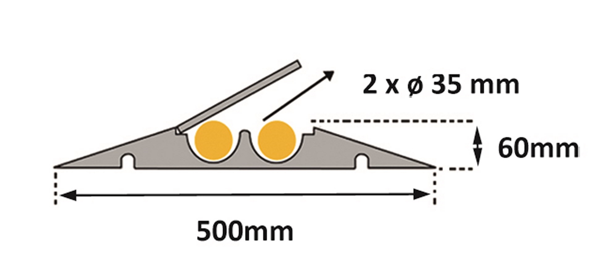 Der Kabelübergang schützt vor unbeabsichtigtem Stolpern und ermöglicht das sichere Überqueren von schweren Geräten. Er bietet mechanischen Schutz für Kabel und Schläuche in Lagern, Produktionsstätten, auf Straßen, Baustellen oder bei Veranstaltungen.