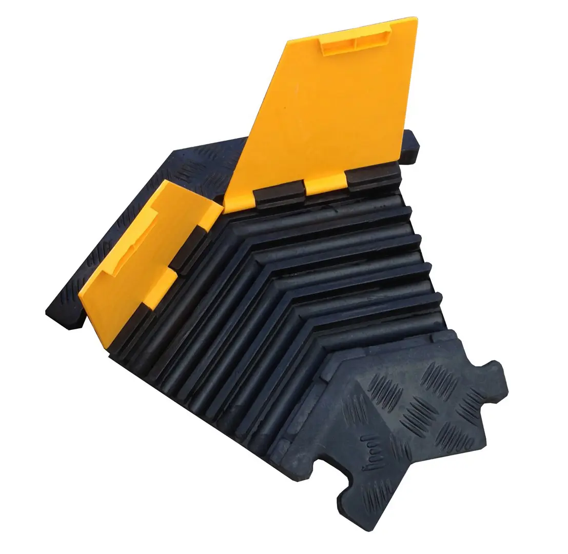 Der Kabelübergang schützt vor unbeabsichtigtem Stolpern und ermöglicht das sichere Überqueren von schweren Geräten. Er bietet mechanischen Schutz für Kabel und Schläuche in Lagern, Produktionsstätten, auf Straßen, Baustellen oder bei Veranstaltungen.