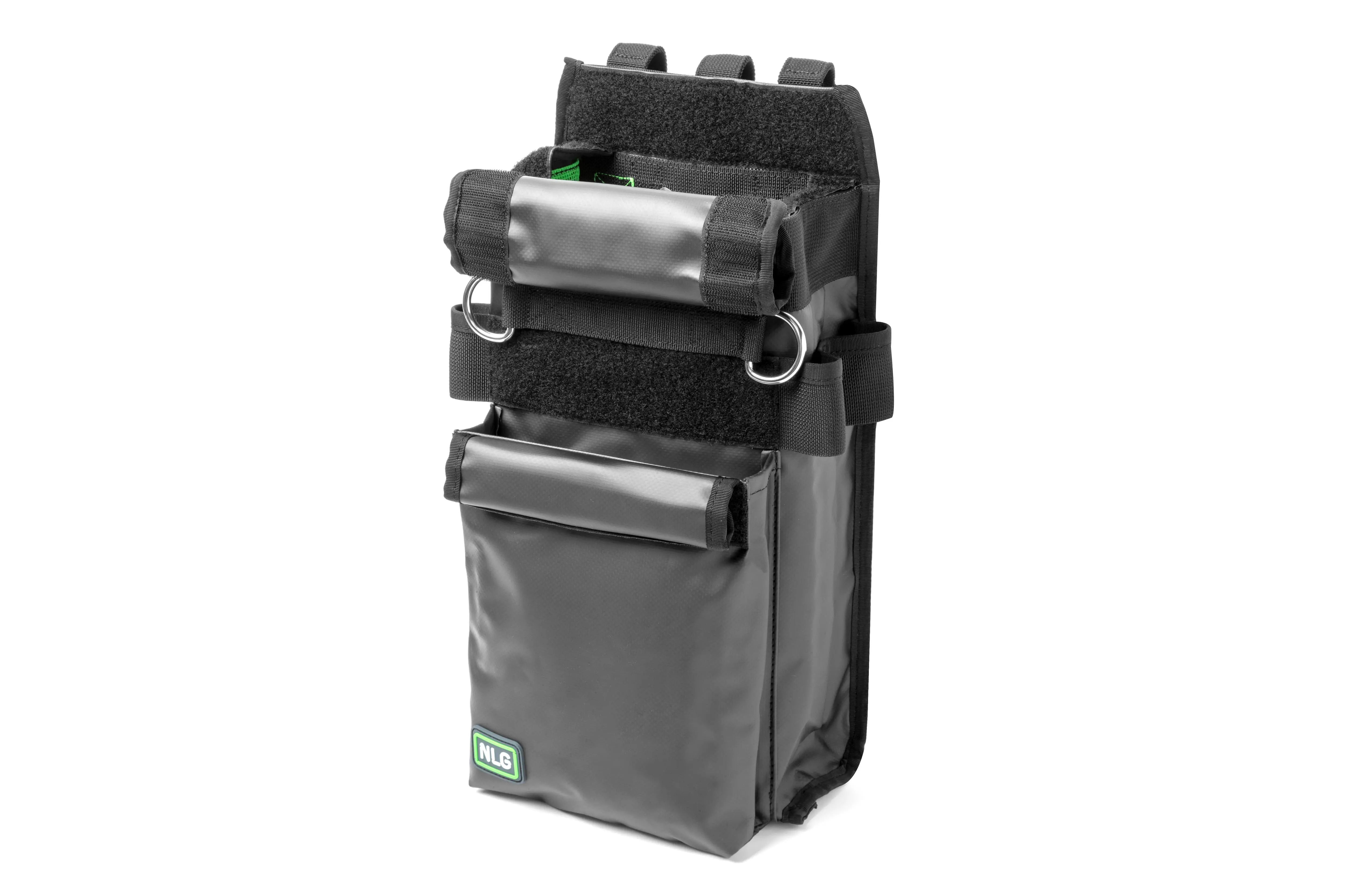 Das große Hauptfach bietet flexiblen Stauraum und schützt den Inhalt während des Transports durch einen Klettverschluss. Eine externe Fronttasche verfügt über einen eigenen Verschluss. Beide Verschlüsse lassen sich in der Arbeitsposition aufrollen, um schnellen Zugriff auf Werkzeuge zu ermöglichen.