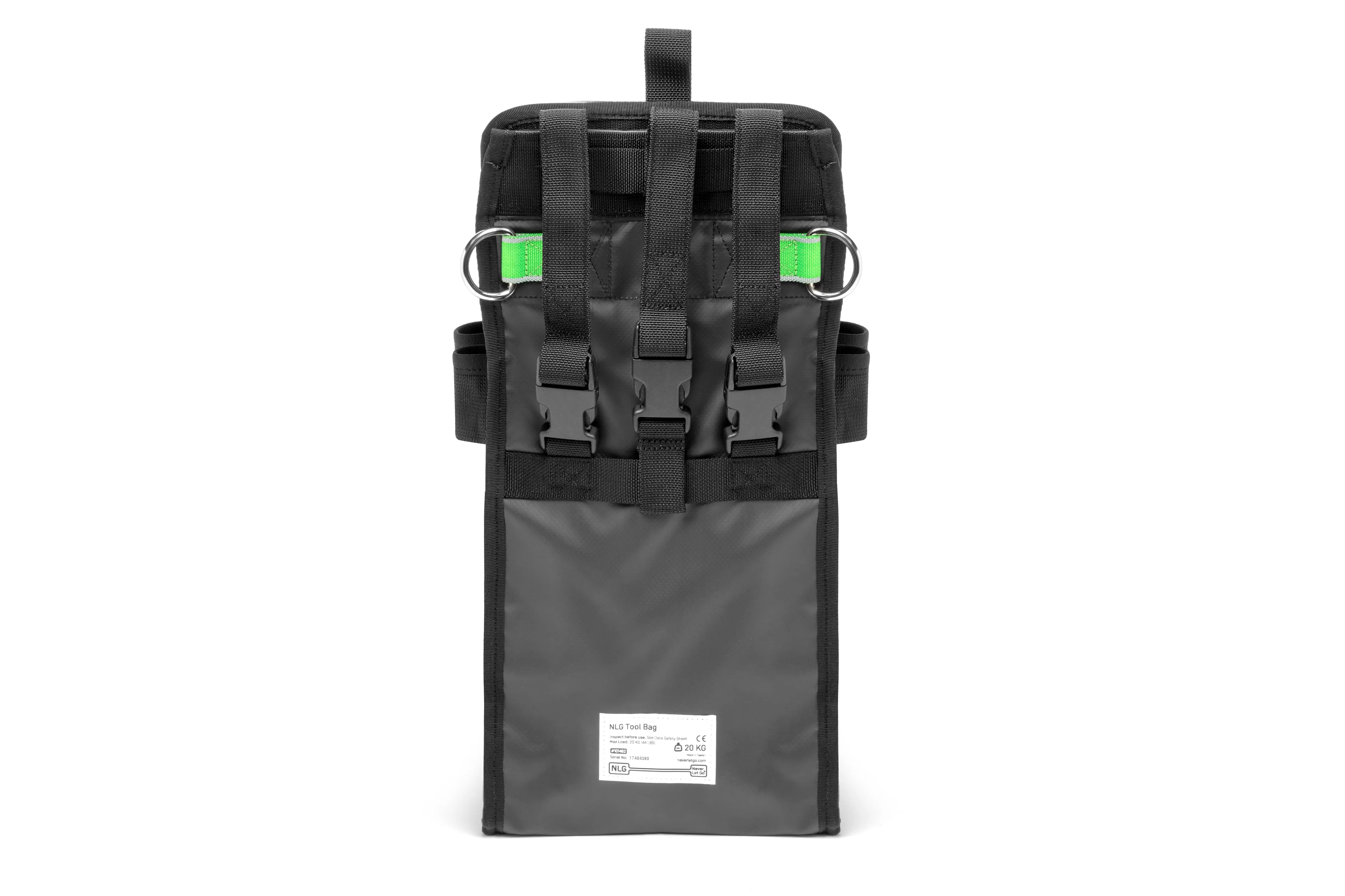 Vier externe Werkzeughalter und sechs integrierte D-Ringe bieten vielfältige Befestigungsmöglichkeiten für Werkzeugschlingen. Rückseitige Schnallen ermöglichen die einfache Befestigung an Gürtel, Gurt oder Geländer. Ein verschiebbarer Mittelriemen sorgt für zusätzliche Stabilität.