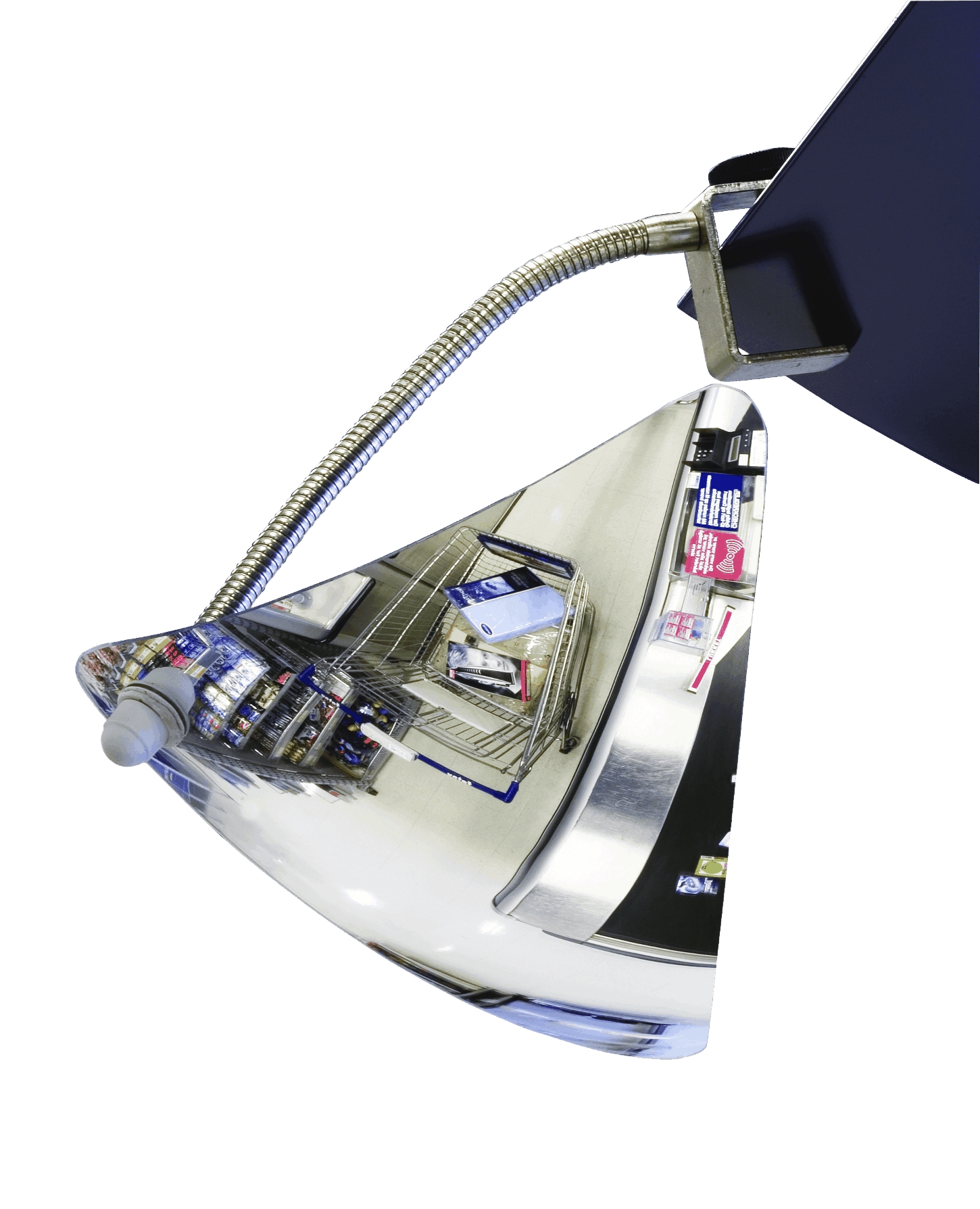 Der Premium Konstrollspiegel wurde speziell für kleinere Kassen oder kleine Abteilungen entwickelt und ist ideal für eine perfekte Sicht im Innenraum. Dieses diskrete und dennoch leistungsstarke Werkzeug gibt Kassierern einen schnellen und klaren Blick auf den Inhalt des Einkaufswagens. Er besteht aus Acryl, das 70 % stoßfester ist als Glas.