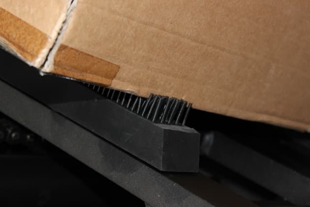 Mobiler magnetischer Prallschutz mit Gummiborsten ist aus 70°-Copolymer hergestellt, wodurch er eine hohe chemische Beständigkeit aufweist. Er wird mit zwei Magneten an Flurförder- und Lagergeräten mit einer sehr starken Magnetbefestigung mit einer Kraft von 78 kg befestigt.