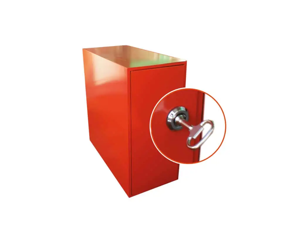 Die Stahlbox dient als Zubehör für die Maxi 15M Barriere zur Aufbewahrung der ungespannten Schranke.