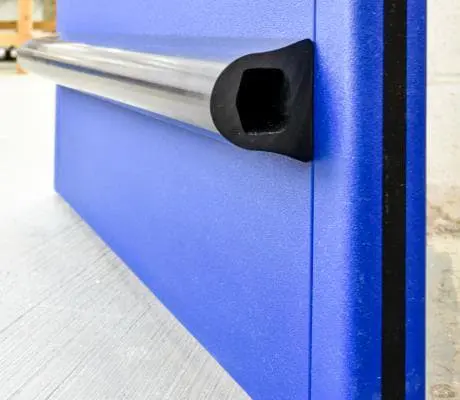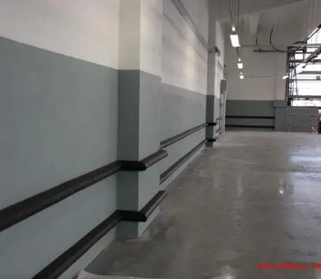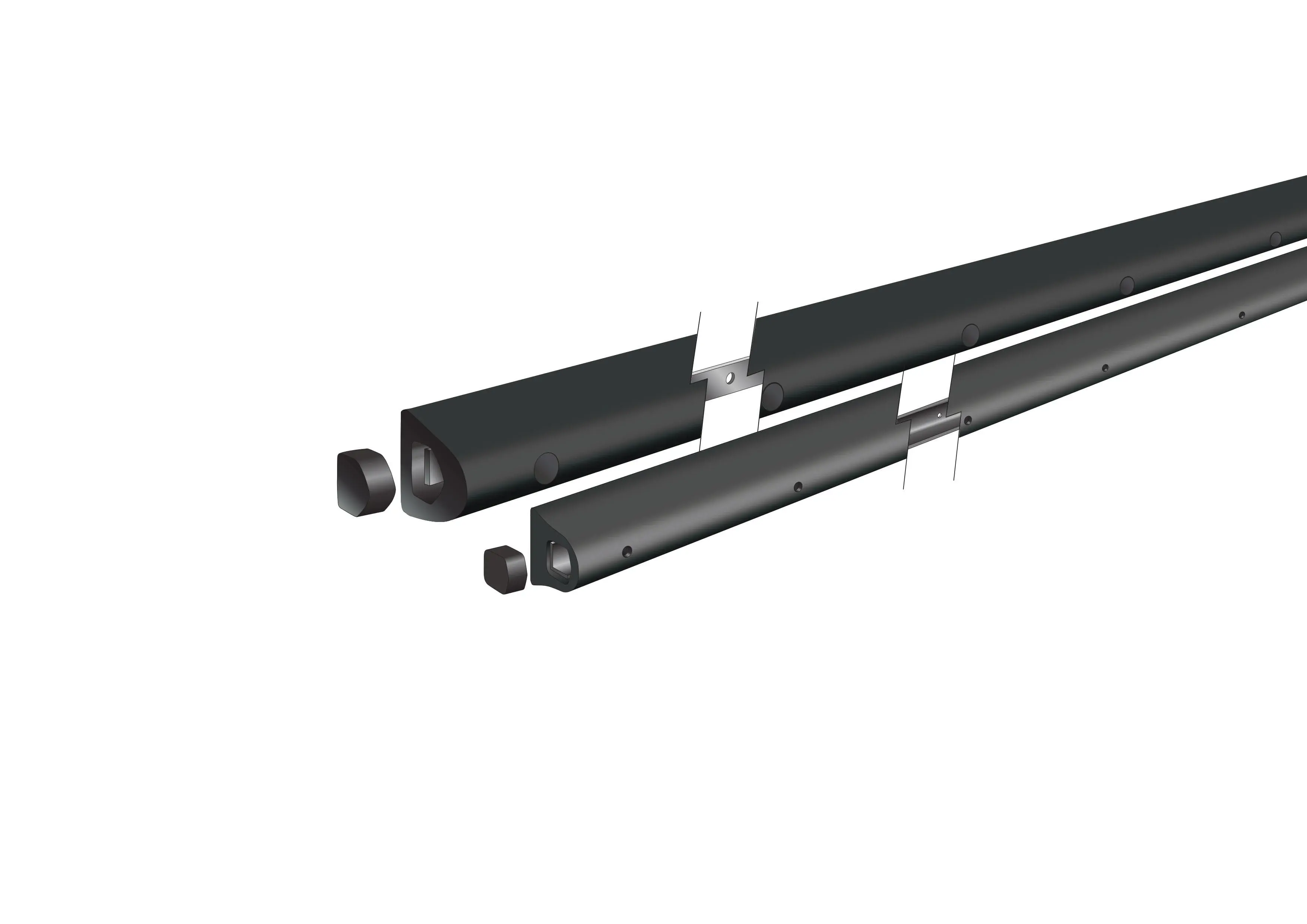 Der Wand- und Eckschutz Rubber D mit Stahlverstärkung besteht aus Gummi und wird durch Verschraubung auf einer Stahl- (40×5 mm) oder PVC-Leiste (25×35 mm) montiert.
