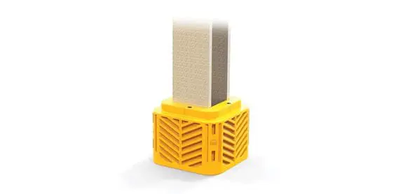 Fünf Größen von Eckstücken und drei Größen von Verlängerungsstücken erlauben die modulare Anpassung an jede rechteckige oder quadratische Säulenform. Die Elemente lassen sich übereinander stapeln, sodass die Energie im gesamten System verteilt wird.