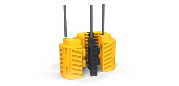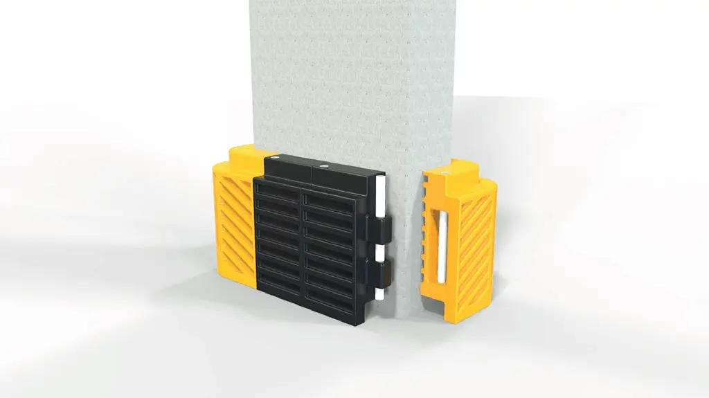 Die Säulenschützer bestehen aus wasserabweisendem Polyethylen. Rippen verstärken die Struktur, und interne Luftkanäle leiten die Aufprallkräfte ab. Die einzelnen Elemente sind über verdeckte Fugen verbunden, wodurch die Barriere insgesamt widerstandsfähiger gegen Stöße wird.
