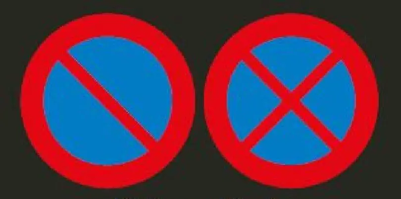 Absolutes Halteverbot: blauer Hintergrund mit rotem Rahmen und zwei sich kreuzenden roten Streifen in der Mitte