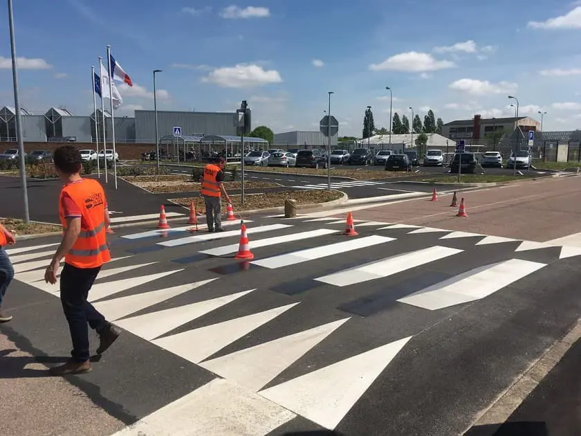 Die vorgeformte Straßenmarkierung „Haifischzähne“ besteht aus thermoplastischem Kunststoff, ist besonders verschleißfest und bietet eine rutschfeste Oberfläche sowie eine bis zu fünfmal längere Lebensdauer als herkömmliche Markierungen.