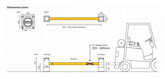 Der Abstand der Trennstege von 10 cm ermöglicht es, die Trennstege der Barriere mit einem kleinen Überhang durch die Regalständer einzuführen. Die Endregalbarriere wird empfohlen, mit Barrieren vom Typ ForkGuard kombiniert zu werden, um den Aufprall von Gabelstaplern in geringer Höhe vom Boden zu verhindern.