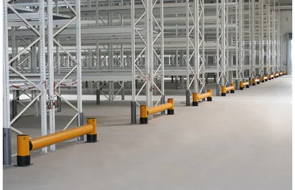 Der Abstand von 20 cm zwischen den Trennwänden bietet die Möglichkeit, die Länge der Schranke mit dem Überhang durch die Regalständer zu variieren. Die schwenkbare Doppelummantelung der Pfosten verteilt die Aufprallkräfte und schützt die Pfostenstruktur selbst vor Stößen durch Metallpaletten und scharfe Gabeln des VZV. Um Gabelstöße in geringer Höhe zu verhindern, kann die Schutzeinrichtung mit einem Bordstein vom Typ ForkGuard kombiniert werden.