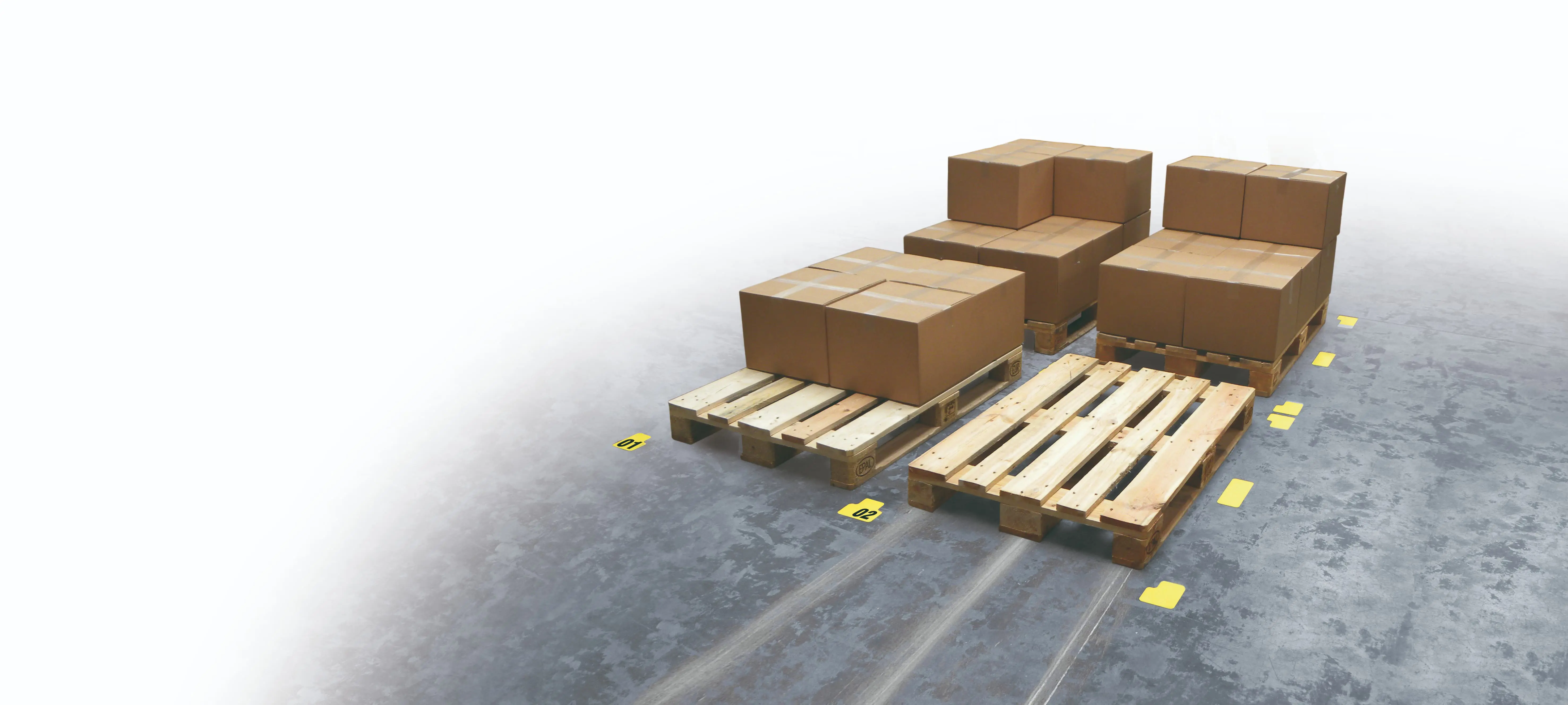 Die Anbringung ist einfach und schnell und erfolgt auf einem glatten Hallenboden. Die Palettenplatzmarkierung ist für Bereiche mit Paletten- und Gabelstaplerbewegungen und Reinigungsmaschinen geeignet.