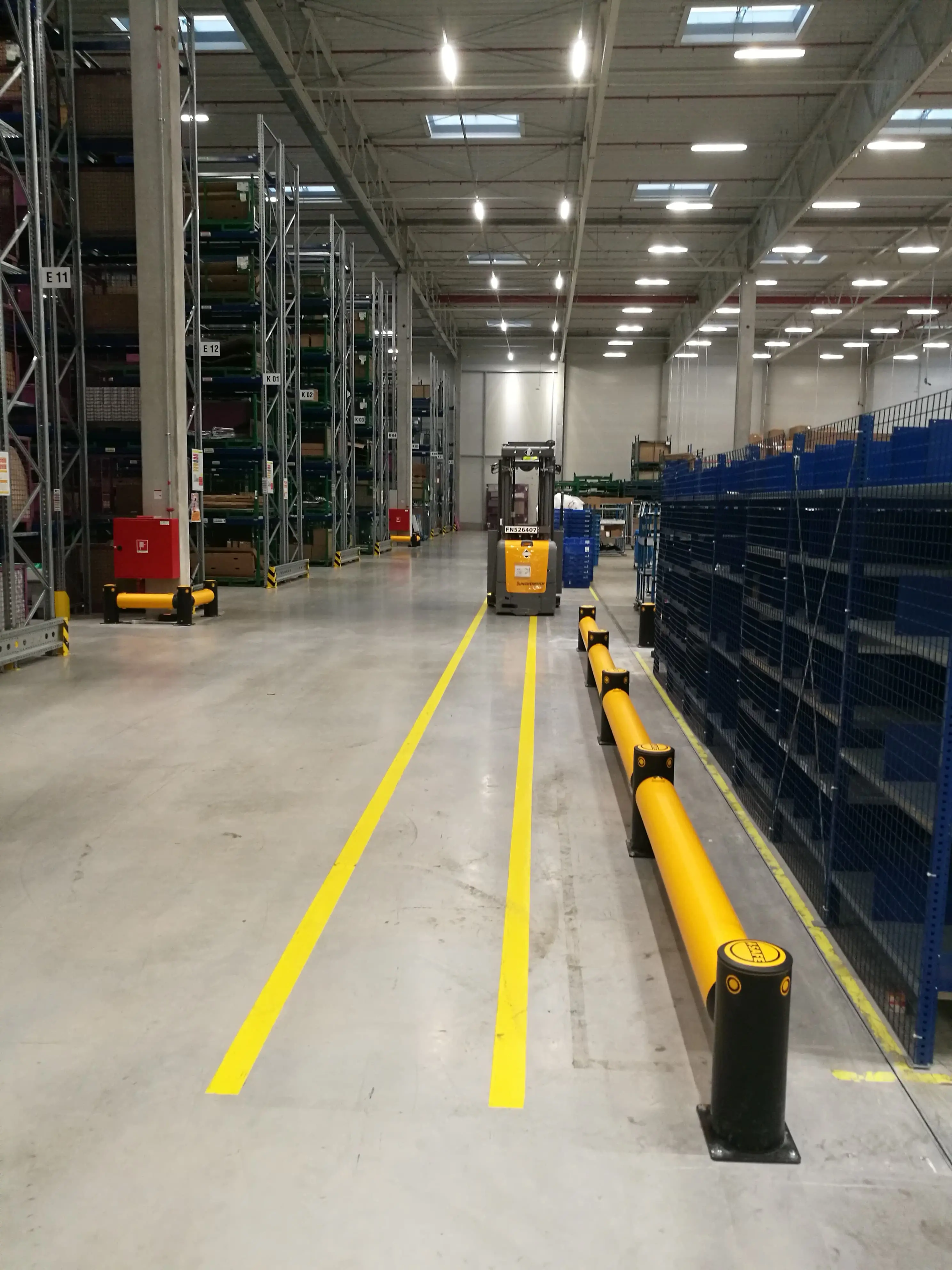 Das markante gelbe Design definiert visuell eine sichere Fahrtrichtung für Fahrzeugführer in Innen- und Außenbereichen.