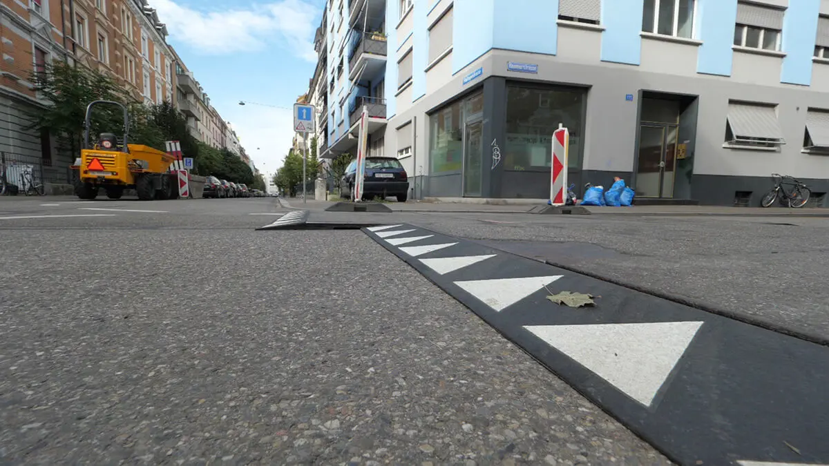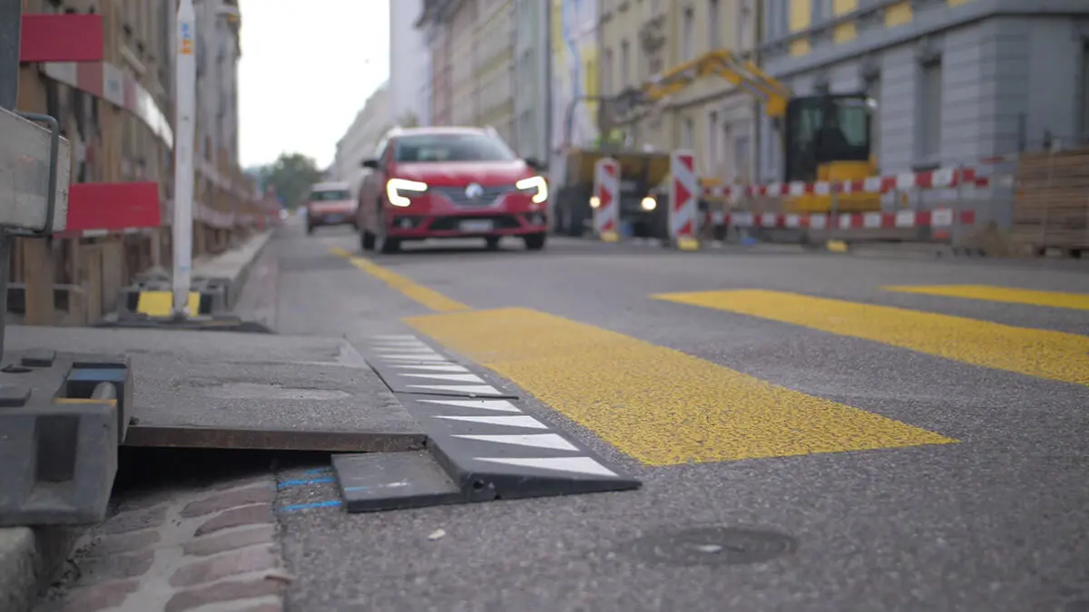 Die Auffahrrampen für Stahlplatten werden bei Aushubarbeiten, im Straßenbau und bei der Straßeninstandhaltung eingesetzt, um die Durchfahrt von Pkw und Lkw zu sichern. Die Rampe besteht aus speziell entwickeltem, recyceltem Gummi und ist daher hochzug- und druckfest. Sie reduziert den Lärm, der durch den Aufprall von Stahlplatten auf die Straßenoberfläche entsteht. Sie ist besonders für den Einsatz in Wohngebieten geeignet. Die Oberfläche ist wasserabweisend und hat eine rutschhemmende Wirkung.